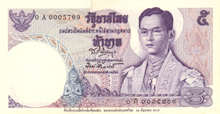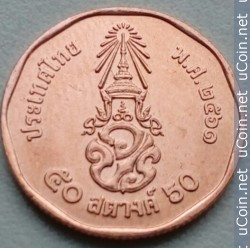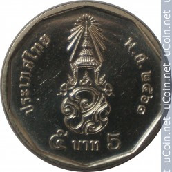 5铢正面为普密蓬国王于1963年,诞辰36周年(第三周期,12年为一个周期)时皇家巡游的场景。