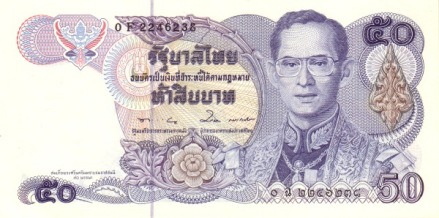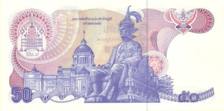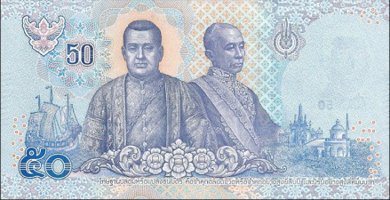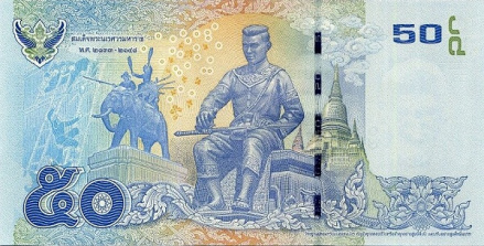 50泰铢面值图片正面图案正面:泰国国王普密蓬·阿杜德(Bhumibol Adulyadej)1927-2016。背面:泰国大城王朝君主纳黎萱大帝(Naresuan)。前景为大帝特写,后景取自1593年泰缅廓沙拉之战中,纳黎萱骑乘战象斩杀缅甸东吁王朝王储的情景,以纪念这场泰国历史上的辉煌胜利。票面为蓝色,纸币尺寸为144 x 72 mm。
