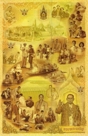 背面描绘的是普密蓬国王从童年开始的皇室活动等大事。