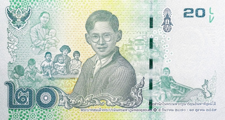20泰铢面值图片正面图案正面:泰国国王普密蓬·阿杜德(Bhumibol Adulyadej)1927-2016。背面:泰国历史上著名帝王之一的兰甘亨大帝,纸币尺寸为138 x 72 mm。