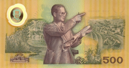发行于1996年6月6日,与流通中的第十四套面额500铢的纸币特性及尺寸大小类似,不同之处在于正面中间偏左位置的御玺换成了国王陛下即位50周年金禧纪念的皇家盾徽