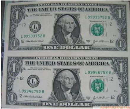 5、色泽鉴别:真美元的正面人物、图像、文字、花边等用含有磁性物质乌黑色凹印油墨印制 ,鲜艳夺目,假美元用劣质油墨印制,其色泽与真美元相比反差较大。