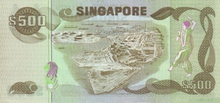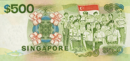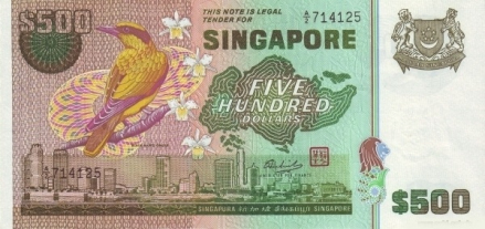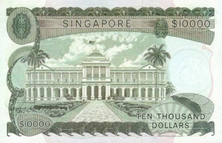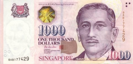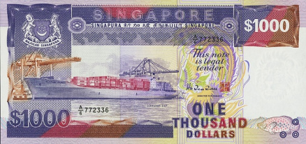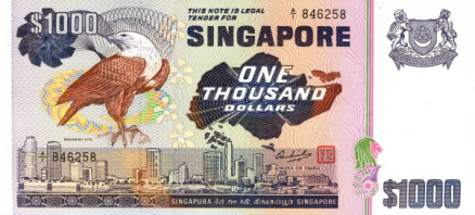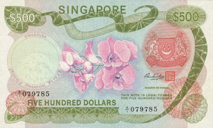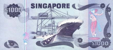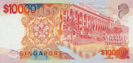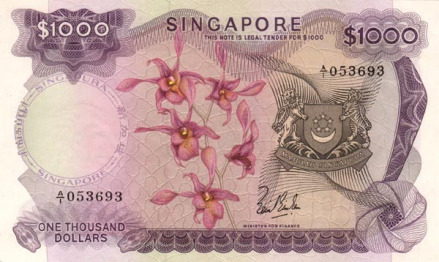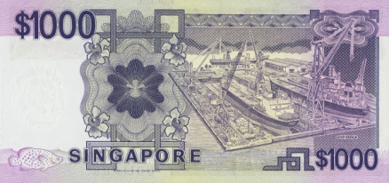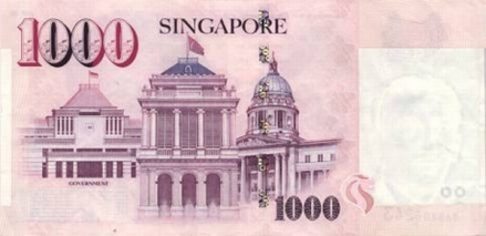 ■1000 元币的正面主景图案为 "胡姬花",背面主景图案为新加坡维多利亚纪念堂和皇后宫,票幅为 15.9× 9.5厘米,主色调为紫红色和深灰色;