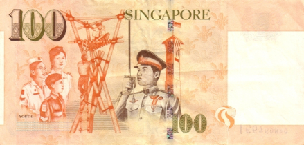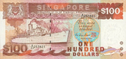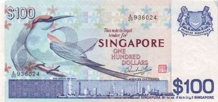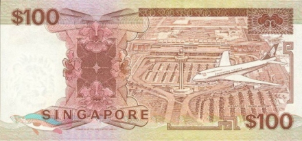 ■100 元币的正面主景图案为 "胡姬花",背面主景图案为新加坡水域的和平景象, 票幅为15.9× 9.5厘米,主色调为蓝色和紫红色;