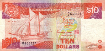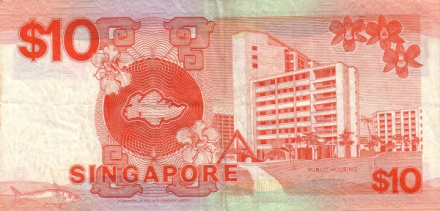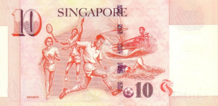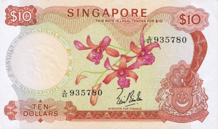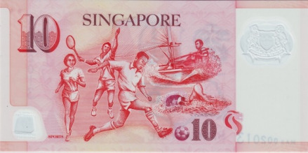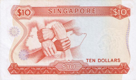 ■10 元币的正面主景图案为 "胡姬花",背面主景图案为以新加坡版图为背景的四只紧握的手,票幅为13.3× 7.9 厘米,主色调为红色;