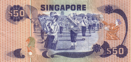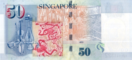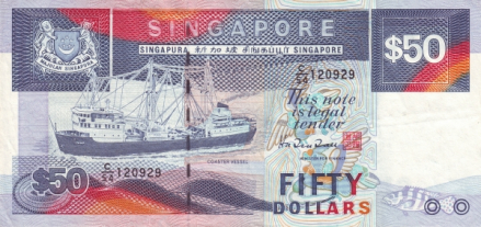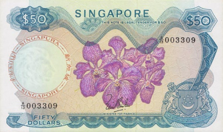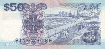 ■50 元币的正面主景图案为 "胡姬花",背面主景图案为新加坡滨海区和克里福德码头, 票幅为14.6× 8.7厘米,主色调为蓝色;