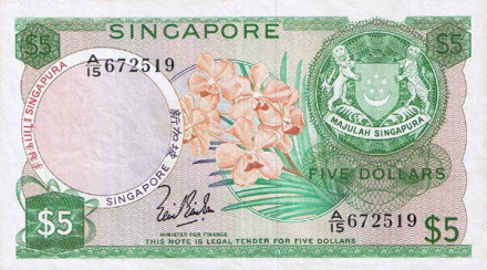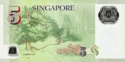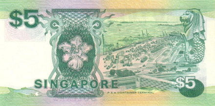 ■5 元币正面图案为“胡姬花”,背面图案为新加坡河上的繁忙景象,票幅为12.7× 7.1厘米,主色调为绿色;