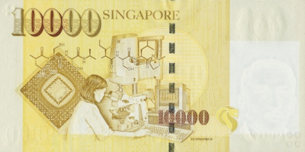 ■10000 元币的正面主景图案为 "胡姬花",背面主景图案为大楼,票幅为 20.3 × 13.3 厘米,主色调为绿色。