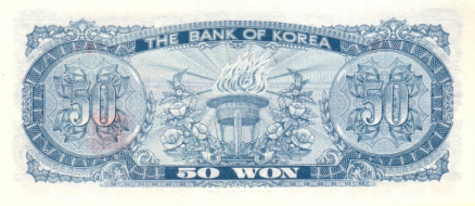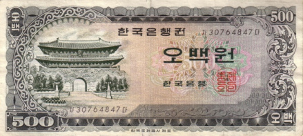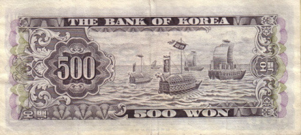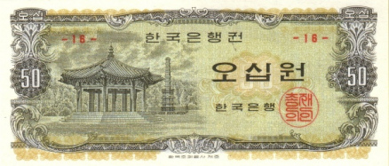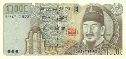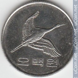 是1975年8月14号发行的,并于1993年5月12号停止发行。纸面规格为163x73mm,为凹版印刷。纸币的正面以退溪李滉的头像和无穷花为象征,背面是陶山书院的图案。