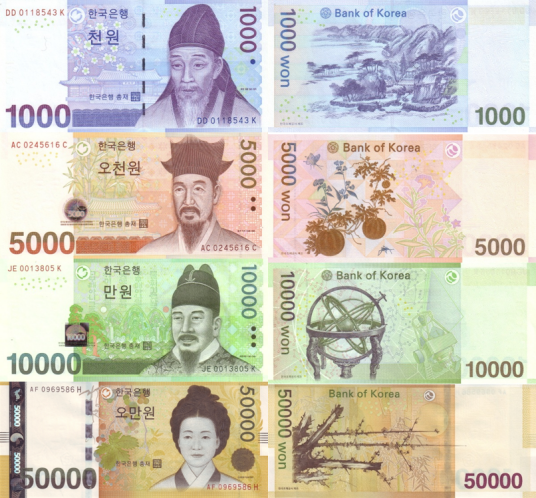 由于韩元汇率高,故1元、5元硬币2001年2月起停止流通。2009年6月23日韩国央行韩国银行发行面额为5万韩元(约合40美元)的钞票,这是该国迄今为止发行的面额最大的钞票。常用读音“WON”“HUAN”为古时候韩币读音用法。
