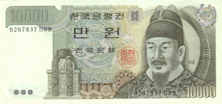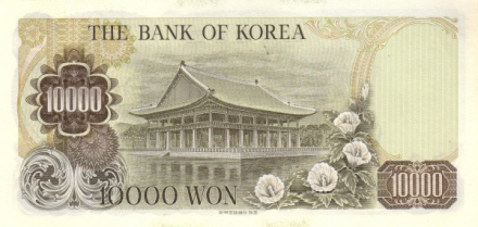 1983年发行的最新币(151mm*76mm),正面是代表韩国的学者退溪李滉先生的图案,背面是退溪李滉先生为他的弟子提高业绩而建立的陶山书院的图案。