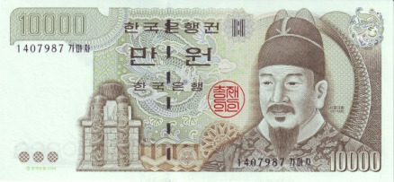 世宗以精通儒学而著称。韩元10,000元正面是被指定为世界遗产的训民正音的创造者世宗大王的图案,背景图案《日月五峰图》和《龙飞御天歌》,背面的背景图案是浑天仪和光学天体望远镜和《天象列次分野地图》。
