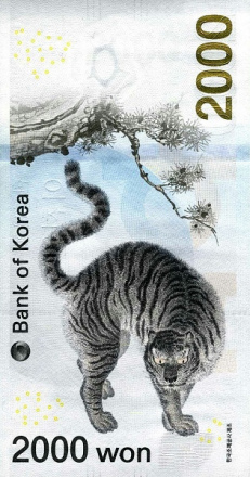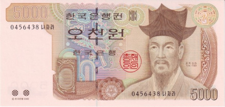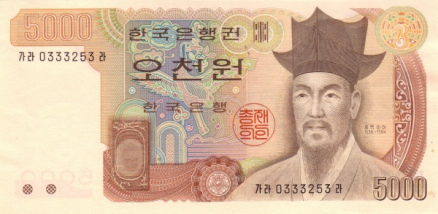韩元5,000元正面图案仍沿用了韩国历史上最伟大的学者栗谷李珥肖像画,还加上了栗谷出生地点乌竹轩图案和竹子。背面图案为李珥的母亲,申师任堂画的《草虫图》。
