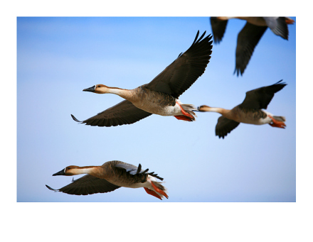除了白额雁外,常见的还有鸿雁、豆雁、斑头雁和灰雁等,在民间通称为“大雁”。大雁是人们熟知的鸟类类群之一,在迁徙时总是几十只、数百只,甚至上千只汇集在一起,互相紧接着列队而飞,古人称之为“雁阵”。“雁阵”由有经验的“头雁”带领,加速飞行时,队伍排成“人”字形,一旦减速,队伍又由“人”字形换成“一”字长蛇形,这是为了进行长途迁徙而采取的有效措施。当飞在前面的“头雁“的翅膀在空中划过时,翅膀尖上就会产生一股微弱的上升气流,排在它后面的就可以依次利用这股气流,从而节省了体力。但“头雁”因为没有这股微弱的上升气流可资利用,很容易疲劳,所以在长途迁徙的过程中,雁群需要经常地变换队形,更换“头雁”。它们的行动很有规律,有时边飞边鸣,不停地发出“伊啊,伊啊”的叫声。迁徙大多在黄昏或夜晚进行,旅行的途中还要经常选择湖泊等较大的水域进行休息,寻觅鱼、虾和水草等食物。每一次迁徙都要经过大约1~2个月的时间,途中历尽千辛万苦。但它们春天北去,秋天南往,从不失信。不管在何处繁殖,何处过冬,总是非常准时地南来北往。