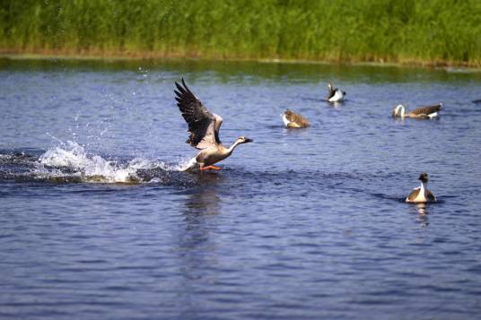 大雁往往成群居于水边,每年春分后飞到北方繁殖,秋分后飞往南方越冬,在晚上睡觉的时候,多单腿着地。