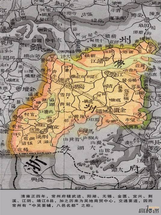 1726年(清雍正四年),常州府的大部分县份都因人口、赋税繁多,而一分为二:从武进县分出阳湖县(今常州市武进区东部),从无锡县分出金匮县(今无锡市东部),从宜兴县分出荆溪县(今宜兴市西南部),因此常州府的辖县增加到8个,称为“常郡八邑”。从这个时代开始,常州便有了“八邑名都,中吴要辅”的美称。