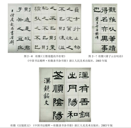桂馥隶书得力于《西岳华山庙碑》等,醇厚朴茂、隽雅清古。桂馥隶书能得“朴实”二字,深于《说文》小学,又能以篆势入隶,笔下无俗字讹体,则完白所不及。桂馥隶书的主要特色是平正通达、醇厚朴茂,典雅高古。桂馥故乡的曲阜孔庙有很多块面貌各异的汉碑,其中的《礼器碑》名碑都给了桂馥精神滋养。虽然桂馥的隶书更多表现的是学者的理智和谨严,笔墨技巧温润,结字工稳平实,难免有失生气灵动以及鲜活的个性特质。但他的书法艺术长期浸润于汉碑,可谓尽得汉隶风神之典范。 桂馥晚年的隶书中,横、竖、撇、捺等笔画大量都以直线的面貌出现,使作品在视觉形象上更加简练概括,如比较。在字形结构上,采取方正端庄的方式处理,使字的中宫部分开阔疏朗以产生向外的张力。