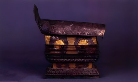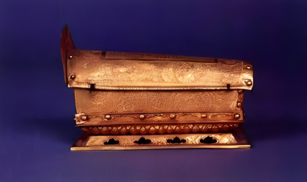 镂空莲花座金棺 | 通长17.8厘米,高7.5~10.7厘米,重331.5克。由棺盖、厢、座三部分组成,前端大,后端小,向前呈倾斜状。棺盖覆瓦形,前端凸出棺厢,大头末端为叶片状档头,用5颗金钉固定,盖两侧各1钉,小头末端边沿4钉。棺盖扣于棺厢上,用18颗金钉铆合。棺置于覆槽状底座上,底座上小下大,四面托板向外平展。盖饰以相对称的鸟、花卉、编织纹;棺厢錾刻蔓草团花,前端一方孔;底座下端镂空呈莲花瓣形,上端呈仰莲瓣形,饰围栏一周。表面装饰繁缛的花朵、蔓草、纹饰。采用捶碟、铆合、掐丝、粘焊、镂雕、镶嵌等手法。 |