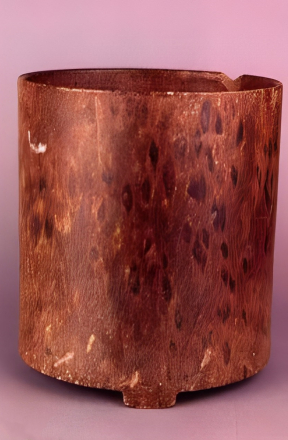 豹斑玉筒 | 形状似尊,高14.6厘米直径为15.5厘米,呈圆柱形,底微外鼓,刻一“朝”字,笔画纤细。豹皮纹理遍布四周,斑点皆天然生成,半透明状。此物是用一整块玉石雕凿而成,采用凿、打磨、抛光等手法。整体呈红褐色,玉质晶莹光润,豹斑纹饰能透出光亮。 |