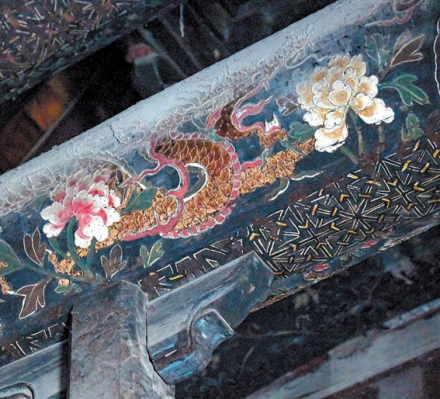 洛阳山陕会馆的庭院北面是拜殿,殿前西侧有清咸丰三年(公元1853年)重修碑记一通,月台前有石狮一对。拜殿即正殿,是会馆的中心大殿。拜殿现存有完整的清代早期点金彩画,虽经岁月侵蚀,但色彩与图案依旧比较精美。再往北,是后殿,檐梁上的斗拱龙头张牙舞爪、腾云驾雾;檐梁下的木门雕花却是人物花鸟,虫鱼细草。
