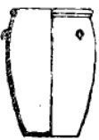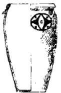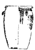 土缸,口径27.5、底径15.5、高41厘米,卷沿,沿下有凹弦纹八道、四鹰咀纽对称 。 |