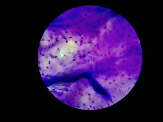 (3)成骨细胞(osteoblast):成骨细胞由骨原细胞分化而来,比骨原细胞体大,呈矮柱状或立方形,并带有小突起。核大而圆、核仁清楚。胞质嗜碱性,含有丰富的碱性磷酸酶。电镜下,胞质内有大量的粗面内质网、游离核糖体和发达的高尔基复合体,线粒体亦较多。当骨生长和再生时,成骨细胞于骨组织表面排列成规则的一层,并向周围分泌基质和纤维,将自身包埋于其中,形成类骨质(osteoid),有骨盐沉积后则变为骨组织,成骨细胞则成熟为骨细胞。