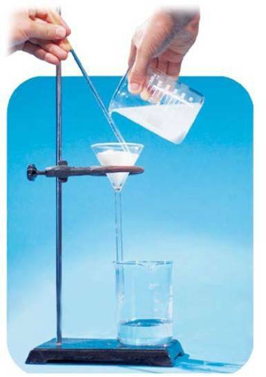 过滤时应注意:漏斗要放在漏斗架上,调整好漏斗架的高度,使漏斗的出口靠在接收器的内壁上,这样,滤液可顺着器壁流下,不致四溅。先转移溶液,后转移沉淀。这样就不会因沉淀堵塞滤纸的孔隙而减慢过滤速率。转移溶液和沉淀时,均应使用搅拌棒。转移溶液时,应把溶液滴在三层滤纸的侧面,以防液滴把单层滤纸冲破。加入漏斗中的溶液不能超过圆锥滤纸的总容积的2/3。加得过多会使溶液从滤纸和漏斗内壁间流入接收器而失去滤纸的过滤作用。