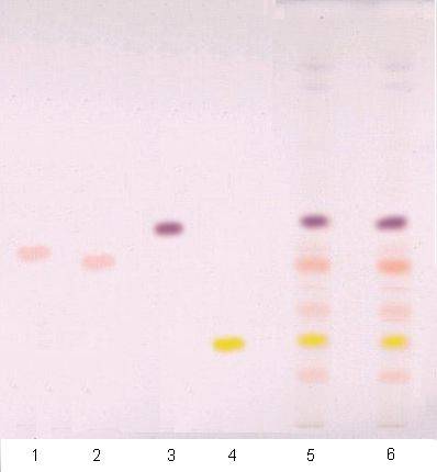 食品中的营养成分是蛋白质、氨基酸、糖类、油和脂肪、维生素、食用色素等。与食品和营养有害的物质则有残留农药、致癌的黄曲霉素等。这些成分都可用薄层色谱法定性和定量。蛋白质和多肽水解为氨基酸,对不同来源的动物性和植物性蛋白水解后产生不同的氨基酸进行定性和定量,有助于解决蛋白质的结构和食品营养问题。二十多种氨基酸用硅胶G薄层板双向展开,一次即能分开,然后定性和定量,方法快速而简便。多糖和寡糖可水解为单糖,可用薄层色谱法进行单糖和双糖的定性和定量。文献上有每一个糖的Rf值和相应的展开剂。油和脂肪解为脂肪酸,脂肪酸的种类和结构中的不饱和键数,与营养和卫生有关,关于油和脂肪的薄层(硅胶、硅藻土、纤维素)分析,文献和综述很多。脂溶性和水溶性维生素在薄层上可方便地定性和定量,例如脂溶性维生素A,D,E,K及B2,B6,B12,酶酸,泛酸,叶酸,C,促生素在硅胶G薄层上可用苯:甲醇:丙酮:冰醋酸(7:2:0.5:0.5)分开。用硅胶G薄层和丙酮:氯仿(1:1)以及激发波长365nm和波长450nm,可用荧光法测定ng量的曲黄素B1,B2,G1,G2,法灵敏快速。
