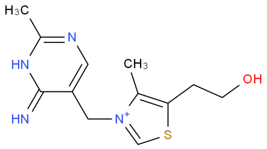 硫胺素常以其盐酸盐的形式出现 ,分子式C12H17ClN4OS·HCl,分子量337.29。又称盐酸硫胺。白色结晶性粉末。有微弱特臭、味苦,有潮解性。熔点248℃,易溶于水,微溶于乙醇,不溶于醚和苯中。维生素B1具有维持正常糖代谢及神经传导的功能。自然界中以酵母中维生素B1含量最多。可由2-甲基呋喃和乙烯腈等合成或由β-乙氧基丙酸乙酯和甲酸乙酯等合成。