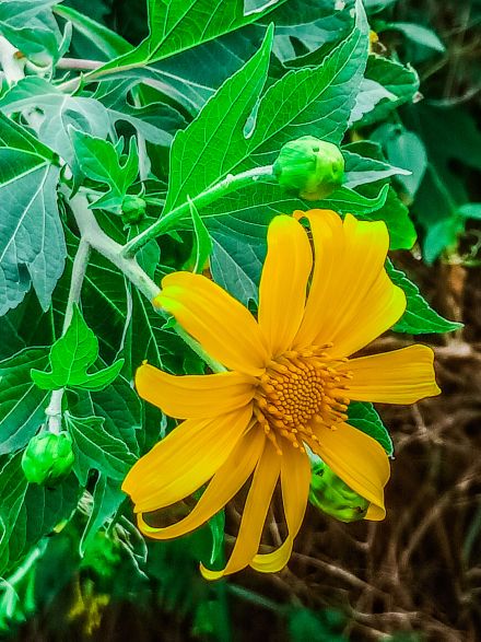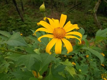肿柄菊(Tithonia diversifolia (Hemsl.) A. Gray)是菊科肿柄菊属的一年生草本植物。株高达5米;茎分枝粗壮,密被短柔毛或下部脱毛;叶卵形、卵状三角形或近圆形,上部叶有时分裂,裂片卵形或披针形,有细锯齿,下面被柔毛;头状花序,顶生于假轴分枝的长花序梗上;总苞片,外层椭圆形或椭圆状披针形,内层苞片长披针形,舌片长卵形,管状花黄色;瘦果长椭圆形;花果期9-11月。