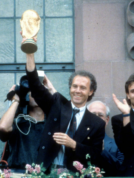 1990年6月,在意大利举行的世界杯中,使用3-5-2阵型的贝肯鲍尔将大部分比赛的中场控制权掌握在了联邦德国队手中。 联邦德国在小组赛阶段以2胜1平的战绩晋级,随后在淘汰赛阶段先后战胜荷兰队、捷克斯洛伐克队、英格兰队、阿根廷队夺得冠军,贝肯鲍尔为此成为足坛历史上第二位在球员时代和执教时代都夺得过世界杯冠军的人物,随后又以53%的得票率被英国足球杂志《世界足球》评为1990年度世界最佳教练。 世界杯结束后,贝肯鲍尔辞去了联邦德国国家队的领队职务。