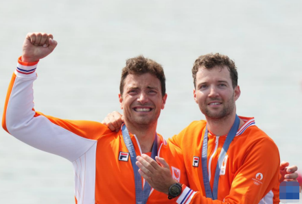 2021年7月28日,2020东京奥运会赛艇项目,在男子双人双桨A组比赛中,荷兰组合梅尔文-特维拉尔/斯特凡-布罗宁克获得银牌。