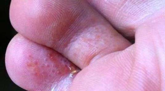 4. 足趾间常见有湿烂,表皮潮湿、浸软、色白,剥脱后可见基底鲜红而糜烂,瘙痒较重。可继发细菌感染而有恶臭。