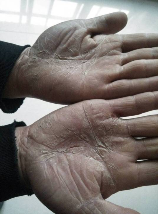手掌局部有边界明显的红斑脱屑,皮肤干燥破裂,甚则整个手掌皮肤肥厚、粗糙、破裂、脱屑,也可见水疱或糜烂。3.