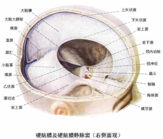 硬脑膜,是一厚而坚韧的双层膜,外层是颅骨内面的骨膜,仅疏松地附于颅盖,特别是在枕部与颞部附着更疏松,称为骨膜层。但在颅的缝和颅底则附着更牢固,很难分离。颅内无硬膜内腔。硬脑膜内层较外层厚而坚韧,与硬脊膜在枕骨大孔处续连,称为脑膜层。主要作用是保护大脑。