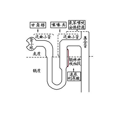 肾内血管渗透压比肾外周血管渗透压低时,易吸收外周血管水份,而用药物降低肾内渗透压使其吸收水份增加,使尿的排出增加而达到利尿的效果。