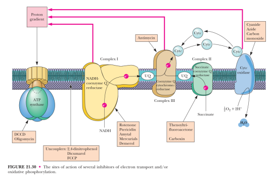 氰化物 一氧化碳 叠氮化物 硫化氢 | 毒素 | 能比氧更强烈地结合细胞色素c氧化酶的铁铜中心,阻止氧的还原,从而抑制电子传递链。 |