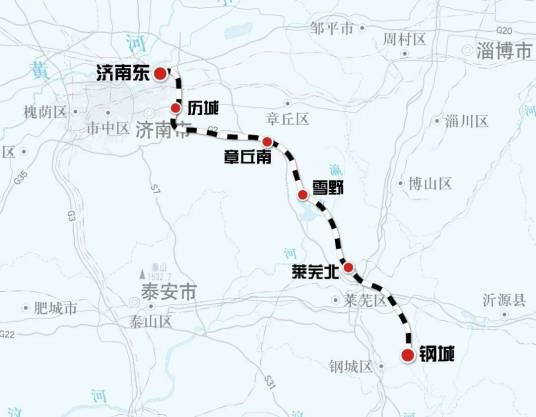 截至2022年12月,济莱高速铁路由济南东站至钢城站,线路全长117.49千米,设6座车站,设计速度350千米/小时。