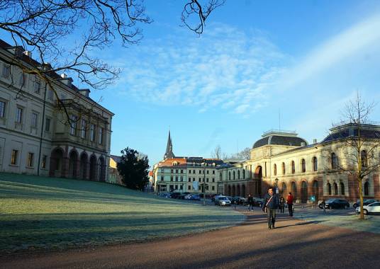 德国国家剧院在剧院广场,门口是歌德和席勒的纪念像。这座建筑早在1779年就作为魏玛宫廷剧院建造。1907年由于建筑安全期原因被拆除,1908年新建了一个新古典主义建筑。