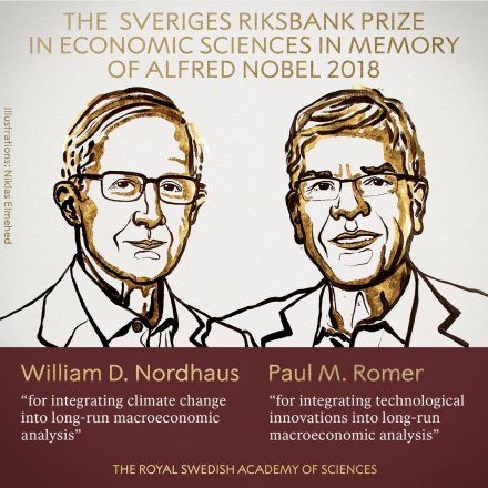 2018年10月8日,2018年诺贝尔经济学奖在瑞典首都斯德哥尔摩公布。瑞典皇家科学院宣布,将该奖授予美国经济学教授威廉·诺德豪斯和美国经济学家保罗·罗默,以表彰二人在创新、气候和经济增长方面研究的杰出贡献。