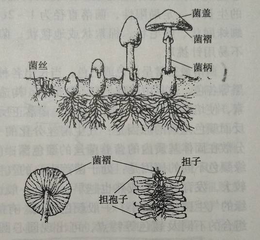 担子菌的特化菌丝形成各种子实体,如蘑菇、香菇等子实体呈伞状,由菌盖、菌柄和菌褶等组成,菌褶处着生担子和担孢子。