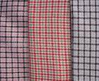 8、粗花呢 粗花呢一般利用两种或两种以上的单色纱、混色纱、合股夹色线、花式线与各种花纹组织配合,织成人字、格子、条子、星点、提花等独特风格的花型。原料则以中低档羊毛、毛黏涤混纺或毛黏腈混纺为主。粗花呢按呢面外观风格可分为呢面、纹面和绒面三种。呢面花呢表面有短绒,微露织纹,质地紧密厚实;纹面花呢表面花纹清晰,织纹均匀,身骨较挺有弹性。绒面花呢表面有绒毛覆盖,绒毛整齐,手感柔软。