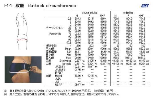由此可见,同身高,女性臀围数值明显大于男性。 (3)《AIST/HQL人体寸法・形状データベース2003》中,殿囲(Hip circumference)统计量【青年群】(单位:mm)如下,以供参考 : - | 被験者数 N | 平均値 Mean | 标准偏差 S.D. | 最小値 Min. | 最大値 Max. | 5パーセンタイル値 5percentile | 50パーセンタイル値 50percentile | 95パーセンタイル値 95percentile | 男 | 49 | 907.6 | 52.2 | 786.0 | 1029.0 | 837.4 | 907.0 | 998.0 | 女 | 48 | 900.2 | 50.1 | 816.5 | 1031.0 | 831.3 | 896.0 | 1006.9 |