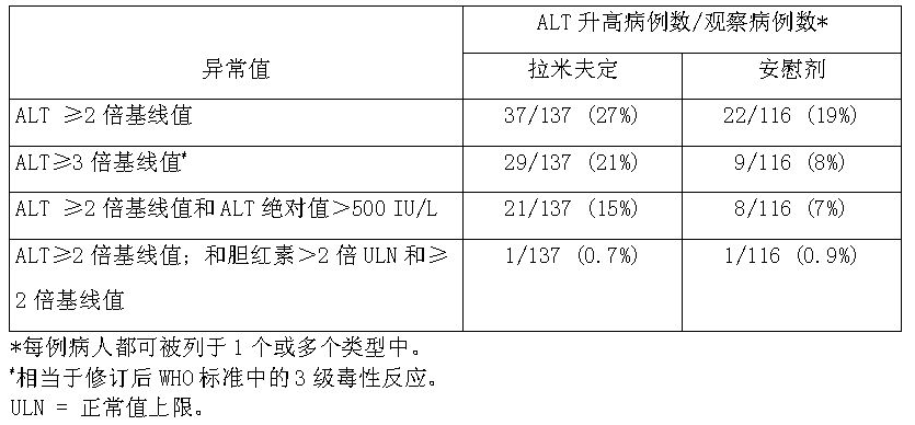 2、肝炎的治疗结束后恶化:在停止拉米夫定治疗后已经发生了肝炎恶化的临床表现和实验室检查证据(除了在停止治疗后经常观察到的HBVDNA重新出现之外,主要通过血清ALT升高来检测这些证据。治疗1年后的病人停药后观察16周,ALT升高的发生率见下表)。尽管大多数事件似乎是自限性的,但已有报告在一些病例中发生死亡。尚不清楚是否与终止拉米夫定治疗之间存在因果关系。在停止治疗后,必须通过临床随访和实验室随访对病人进行密切监测至少几个月。尚无充分的证据能够确定,重新开始治疗是否能改变治疗后肝炎恶化的病程。