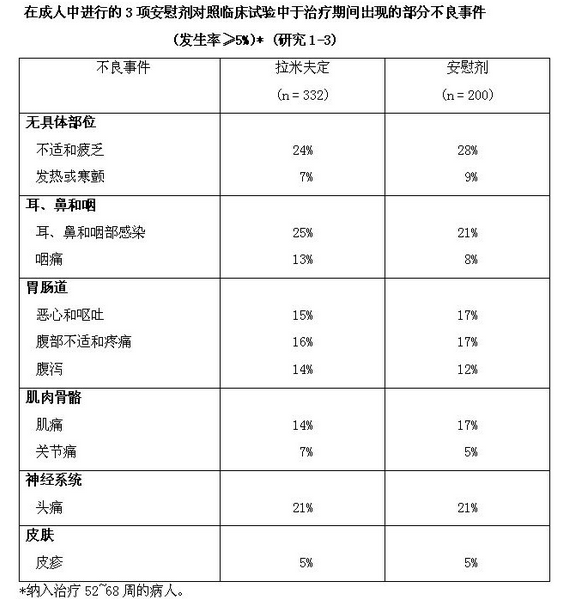 在慢性乙型肝炎病人中进行的临床研究显示,多数患者对拉米夫定有良好的耐受性。不良事件的发生率在拉米夫定组和安慰剂组病人中相似。详见下表。最常见的不良事件为不适和乏力,呼吸道感染、头痛、腹部不适和疼痛、恶心、呕吐和腹泻。在中国进行的2200例IV期临床研究中还观察到以下不良反应:口干1例,全身猩红热样皮疹1例,磷酸肌酸活性酶和血小板降低1例,重症肝炎住院1例。