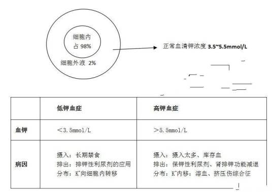人体内的钾主要来源于食物,食物中的钾90%以上短时间内在肠道被吸收,吸收入血液的钾在4h内即有90%从肾排出体外。钾离子大部分(98%)存在于细胞内,少量存在于细胞外液,且浓度恒定。组织细胞中平均含K+150mmol/L,红细胞内含K+约105mmol/L,血清中含K+约4~5mmol/L。体内的钾离子经常不断地在细胞内与体液之间相互交换,以保持动态平衡。钾是维持细胞生理活动的主要阳离子,在保持机体的正常渗透压及酸碱平衡、参与糖及蛋白代谢、保证神经肌肉的正常功能等方面具有重要作用。