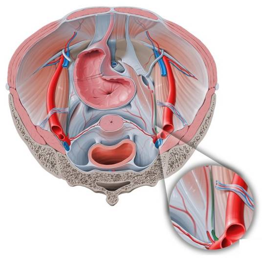 脐动脉 umbilical artery:是胎儿时期的动脉干,出生后其远侧段闭锁形成脐内侧韧带,近端段管腔未闭,与髂内动脉起始段相连,发出2~3条膀胱上动脉,分部于膀胱的上、中部。