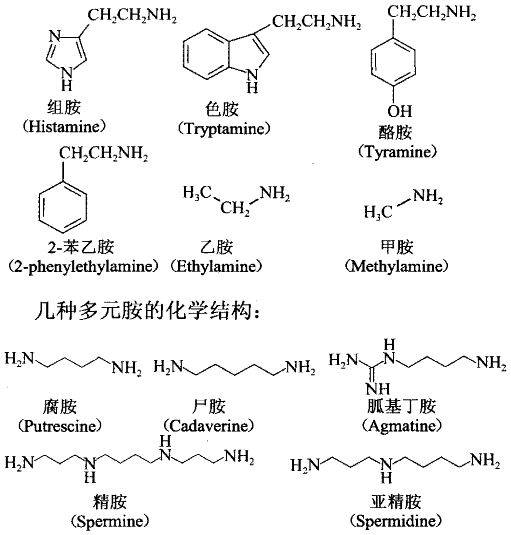 根据生物胺的结构可将其分为三部分:腐胺( putrescine)、尸胺(cadaverin) 、精胺(spermine)、亚精胺(spermidine)等脂肪族胺;酪胺(tyramine)、苯乙胺(phenylethylamine)等芳香族胺;组胺(histamine)、色胺(tryptamine)等杂环胺。它们是生物活性细胞必不可少的组成部分,在调节核酸与蛋白质的合成及生物膜稳定性方面起着重要作用。