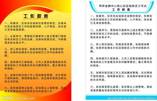 工作职责指在工作中所负责的范围和所承担的相应责任,包括完成效果等。比如:办公室文书岗位职责、办公室公文处理工作职责。