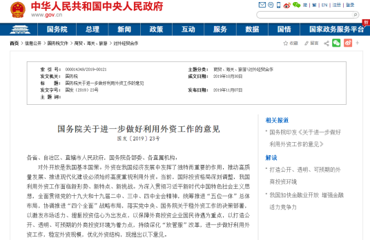 《国务院关于进一步做好利用外资工作的意见》是为深入贯彻习近平新时代中国特色社会主义思想,全面贯彻党的十九大和十九届二中、三中、四中全会精神,统筹推进“五位一体”总体布局,协调推进“四个全面”战略布局,落实党中央、国务院关于稳外资工作的决策部署,以激发市场活力、提振投资信心为出发点,以保障外商投资企业国民待遇为重点,以打造公开、透明、可预期的外商投资环境为着力点,持续深化“放管服”改革,进一步做好利用外资工作,稳定外资规模,优化外资结构提出的意见。由国务院于2019年10月30日发布实施。